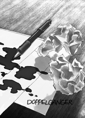 Doppelganger is a short poem comic about a man who writes stories about desperate and suicidal people to cope with his own debilitating problems and inadvertently summons his nemesis.